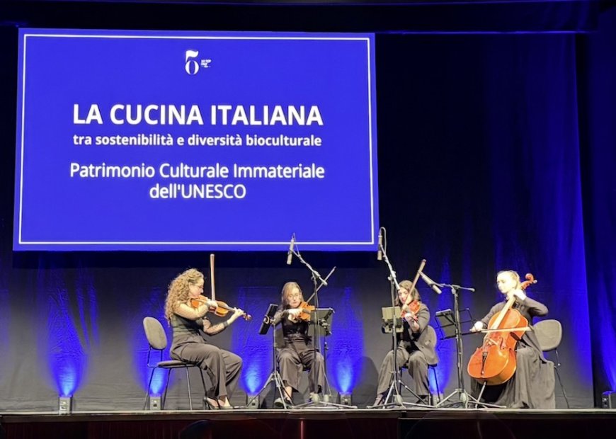 Intermezzo musicale del Carmina Beat Quartet durante il Gran Galà della Cucina Italiana di 50 Top Italy 2026, al Teatro Manzoni di Milano