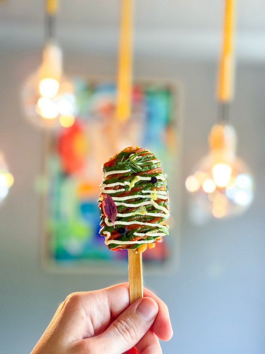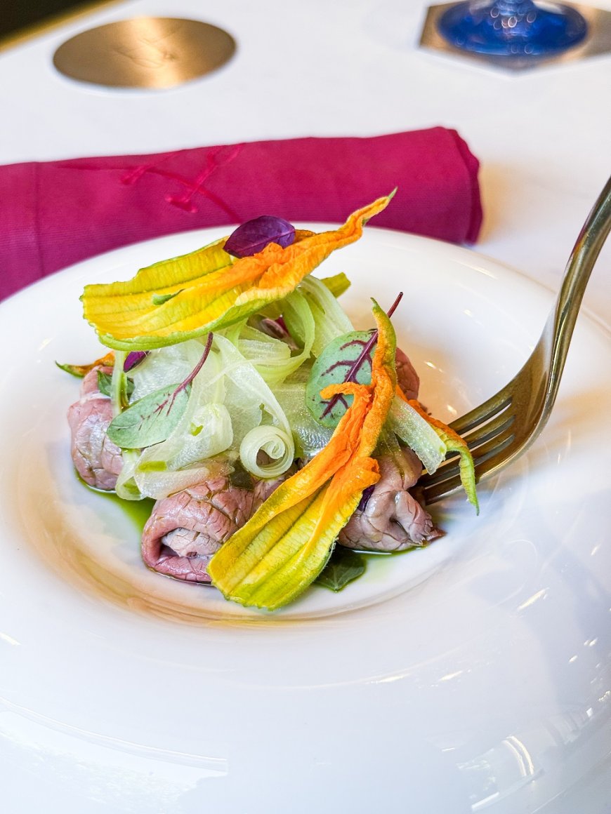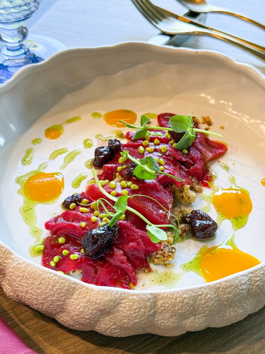 Dopo il successo riscosso in primavera al ristorante AB – Il lusso della semplicità di Venezia, all'interno dello storico Palazzo Vendramin Calergi, le opere cromatiche della pittrice veneta tornano a dialogare con le elaborate proposte culinarie dello chef Borghese, che nel menù disponibile da settembre introduce tre appetitose novità. Gli antipasti Il magatello di Oz (carpaccio di magatello di vitello con crema zucchine alla scapece, fior di zucca, sedano e talli di cappero) e Baccalecca (stecco di baccalà mantecato, panato e fritto con salsa arrabbiata, salsa verde, pil-pil di baccalà e polvere di olive) conquisteranno il palato degli ospiti sin dalle prime portate, mentre Che goduria l'anguria (tagliata di anguria compressa, crumble di cocco e pistacchio, frutta sciroppata, gel esotico, salsa alla mandorla amara, lime crispy e olio al basilico e coriandolo) rappresenta il dolce perfetto per chiudere il pranzo o la cena con freschezza e delicatezza.