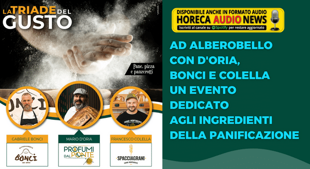 Il 28 marzo si terrà da Profumi dal Ponte ad Alberobello l'evento "La Triade del Gusto" con Mario D'Oria (Profumi dal Ponte), Gabriele Bonci (Naturalmente Bonci) e Francesco Colella (Spacciagrani) che dialogheranno sull’importanza della scelta degli ingredienti di base in panificazione e pizzeria