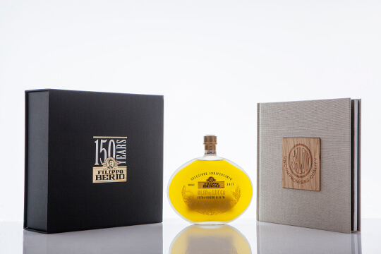 L’elegante cofanetto celebrativo custodisce una bottiglia numerata di Olio Extra Vergine di Oliva Filippo Berio DOP di Lucca, una scelta che è un tributo al luogo in cui ebbe inizio questa storia di un secolo e mezzo.