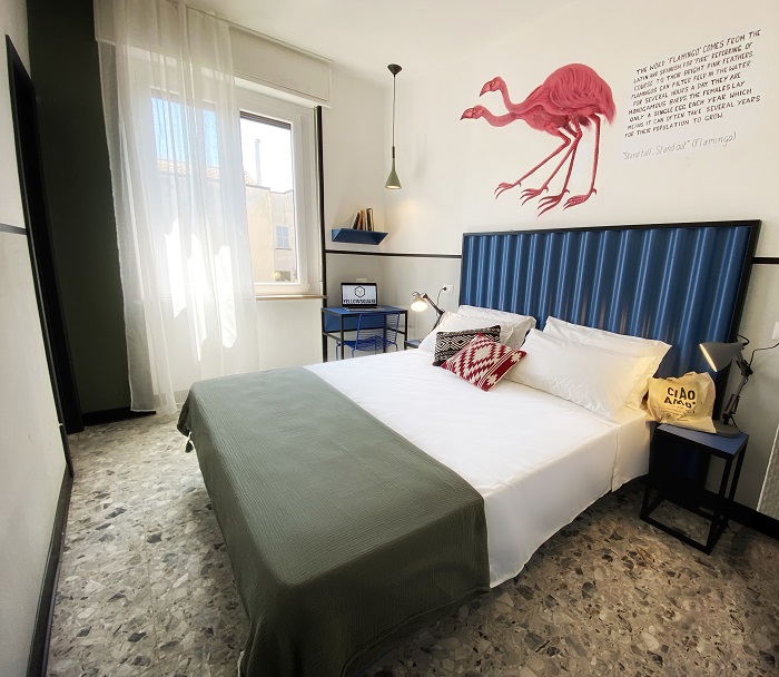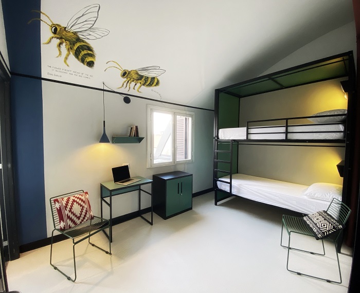 La sensibilità per la sostenibilità, per esempio, si concretizza sia nei servizi green 100% plastic-free del bar e della cucina, sia nella decorazione degli spazi: in ogni camera gli ospiti troveranno dei murales di un animale italiano in via d’estinzione realizzati dallo street artist Lorenzo Ticci in arte Cancelletto e, scansionando il QR code preposto, potranno scoprire piccole e preziose storie animate sull’animale protagonista, realizzate da Julio Martinez in arte Waiki Toons.