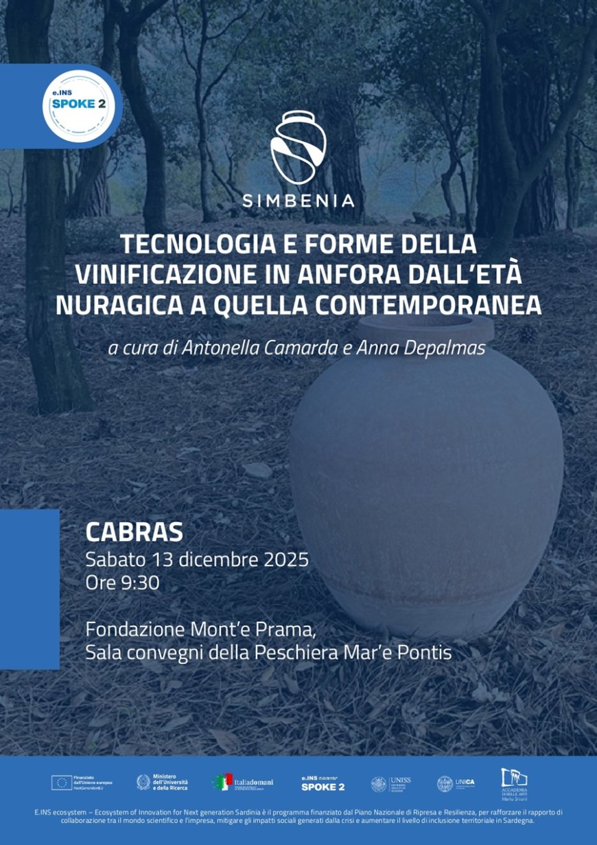 EVENTI - Il 13 dicembre, nella sala convegni della Peschiera Mar’e Pontis di Cabras, la Fondazione Mont’e Prama ospita l’evento “Tecnologia e forme della vinificazione in anfora dall’età nuragica a quella contemporanea” con la presentazione di Simbenia, progetto dell’Università di Sassari sviluppato nell’ambito dell’ecosistema dell’innovazione e.INS, finanziato dal PNRR – Spoke 2, con il sostegno dell’Unione Europea – Next Generation EU.