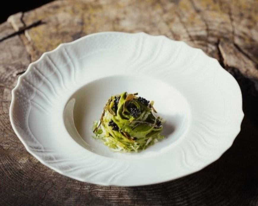 La Millefoglie, piatto manifesto della stagione, è composta da foglie di stagione come shiso, cavolo nero e spinacio selvatico, saltate delicatamente in padella per renderle croccanti. Queste si alternano a strati di maionese al levistico, mela verde, insalatina con salsa verde, noci e crème fraîche, in un gioco fresco e aromatico che celebra texture e profumi.
