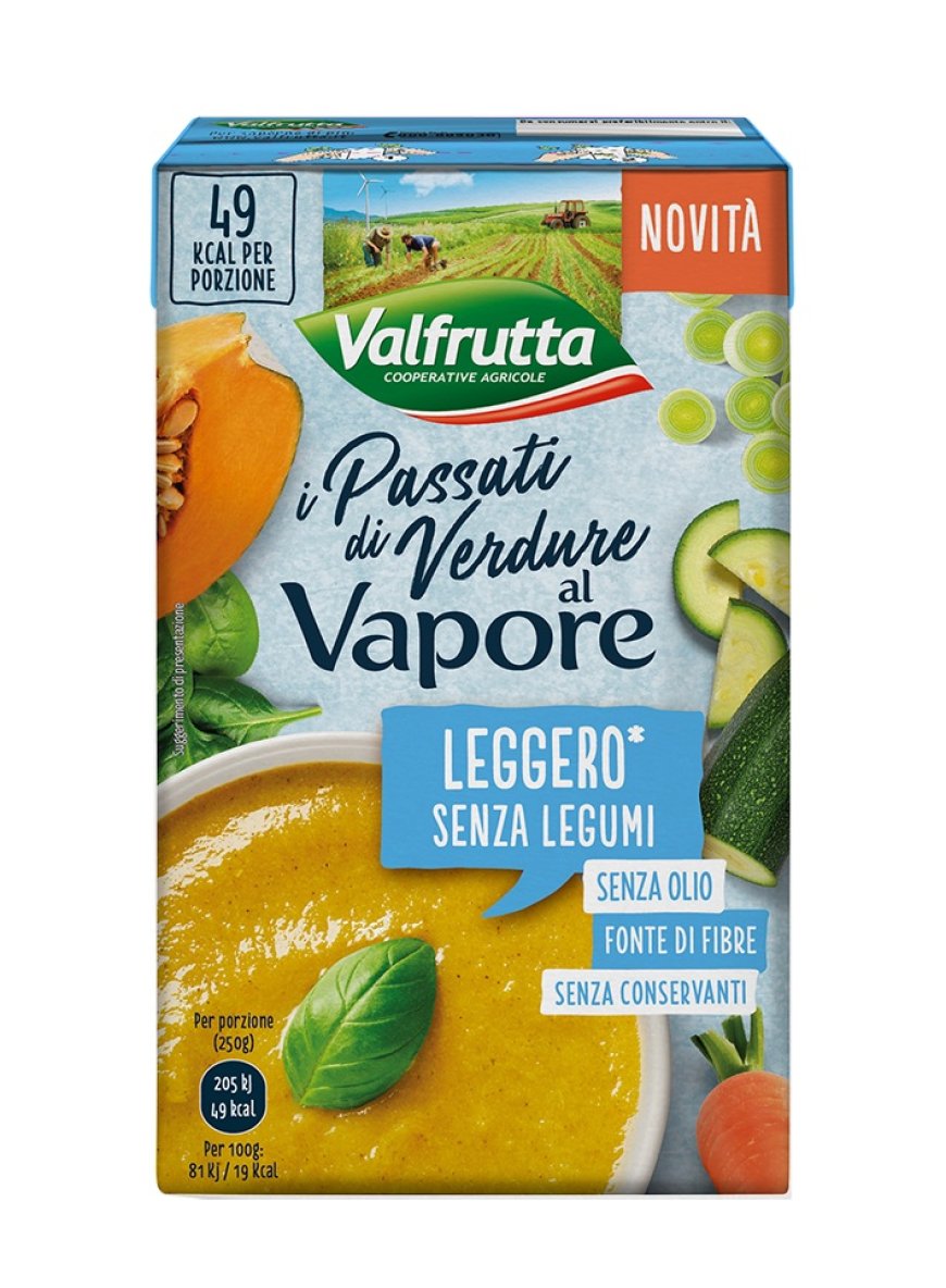 Con il lancio di queste due varianti, Valfrutta arricchisce ulteriormente la propria linea di piatti pronti, che comprende Tutto in un piatto (3 referenze), I Pronti al Vapore (5 referenze), Vellutate al Vapore (2 referenze) e Zuppe al Vapore (2 referenze).