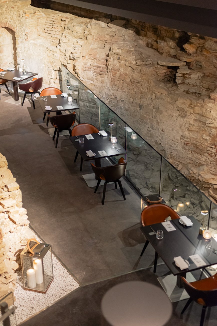 L'intervento architettonico realizzato negli anni Duemila da Adolfo Natalini aveva già valorizzato le strutture originarie con un linguaggio contemporaneo. Porticcioli ha scelto di rispettare quella visione, limitandosi a un restyling discreto che preserva l'identità del luogo. Le sale, arricchite dalle opere dell'artista Paolo Poli, ospitano circa 70 coperti e conducono a una cantina dove il vino si accompagna soprattutto al gin, vero protagonista dell'identità Porticcioli.