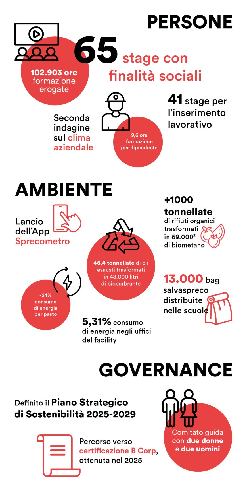L'anno scorso il gruppo ha avviato una sperimentazione per eliminare il packaging monouso nella ristorazione aziendale, in collaborazione con Rosetti Marino S.p.A. e la startup benefit Aroundrs, introducendo un sistema circolare per la gestione dei pasti da asporto tramite contenitori riutilizzabili tracciabili digitalmente. Sono stati risparmiati 1.800 contenitori di plastica monouso e sono state evitate 600 confezioni di posate usa e getta.