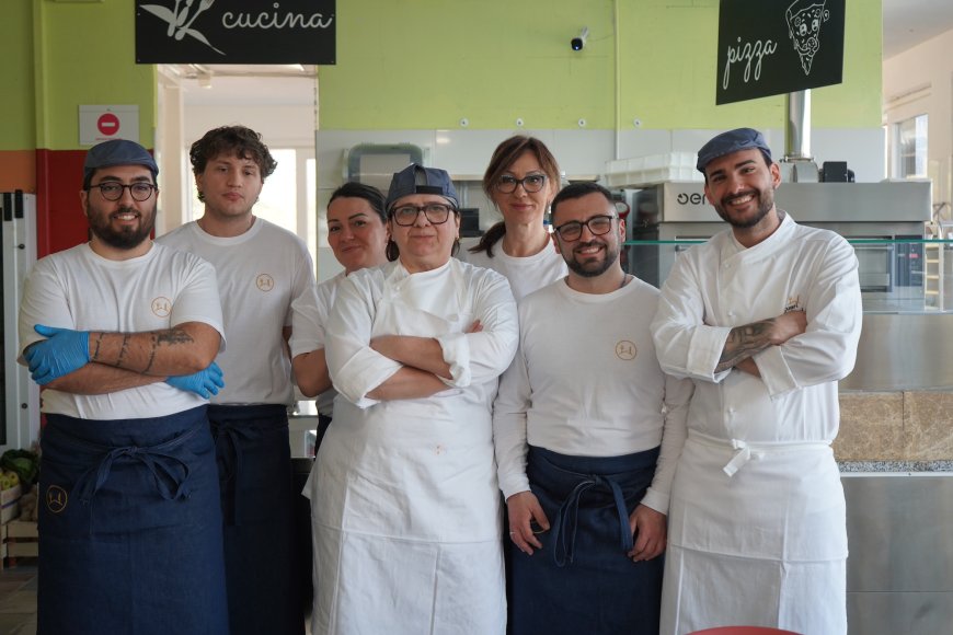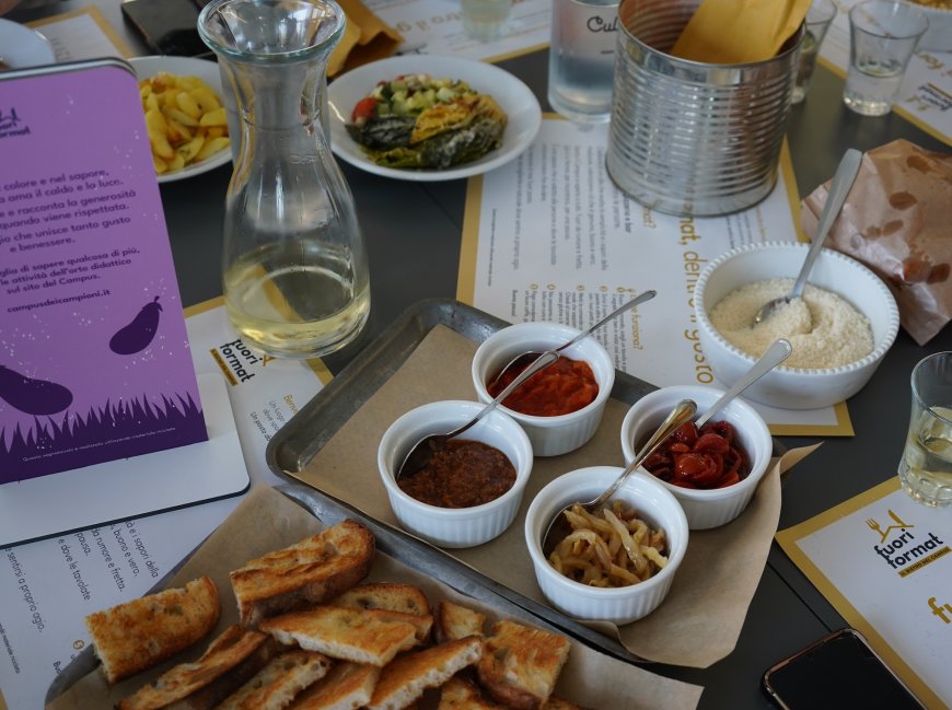 L’impostazione si discosta dai canoni tradizionali della ristorazione: qui la convivialità è centrale, con tavolate condivise, servizio essenziale e un ambiente studiato per favorire la socialità. Anche i dettagli contribuiscono a rafforzare il legame con il contesto: i tavoli sono contrassegnati da icone ispirate alle attività del campus, come animali da cortile o elementi dell’orto, in linea con la vocazione educativa e ambientale del luogo.