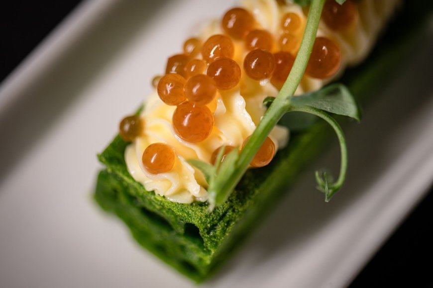 Il menu Experience è composto da 9 portate e già dall'aperitivo si capisce che la cucina segue la stagionalità, senza mai forzarla o stravolgerla. Tra gli antipasti spicca Primavera, una portata in cui le punte di asparagi vengono cotte sottovuoto, alla brace, e infine servite con una salsa dello stesso ortaggio, vaniglia, fiori di sambuco, verjus e una maionese allo zafferano e fiori di sambuco fermentati. A completare il piatto, un olio alla clorofilla di basilico.