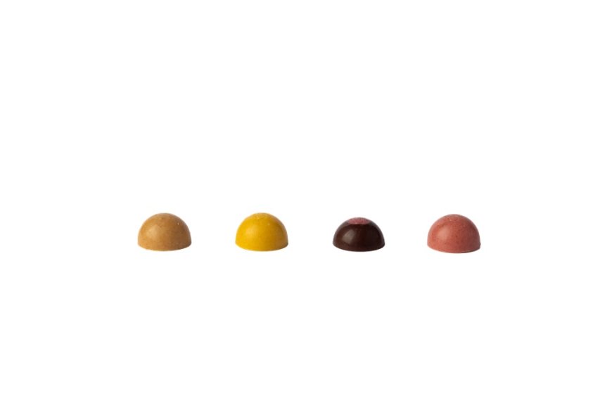 Si amplia anche la gamma delle iconiche semisfere: dalle varianti frutta – Fragola e gruè di Cacao, Pesca ripiena di Crema Cacao, Mango e Fondente al Lampone – ai gusti classici come Fondente con Liquirizia di Calabria, Gianduja pralinato, Latte con Mandorla di Sicilia e Zafferano o con Pistacchio di Sicilia e Caffè.