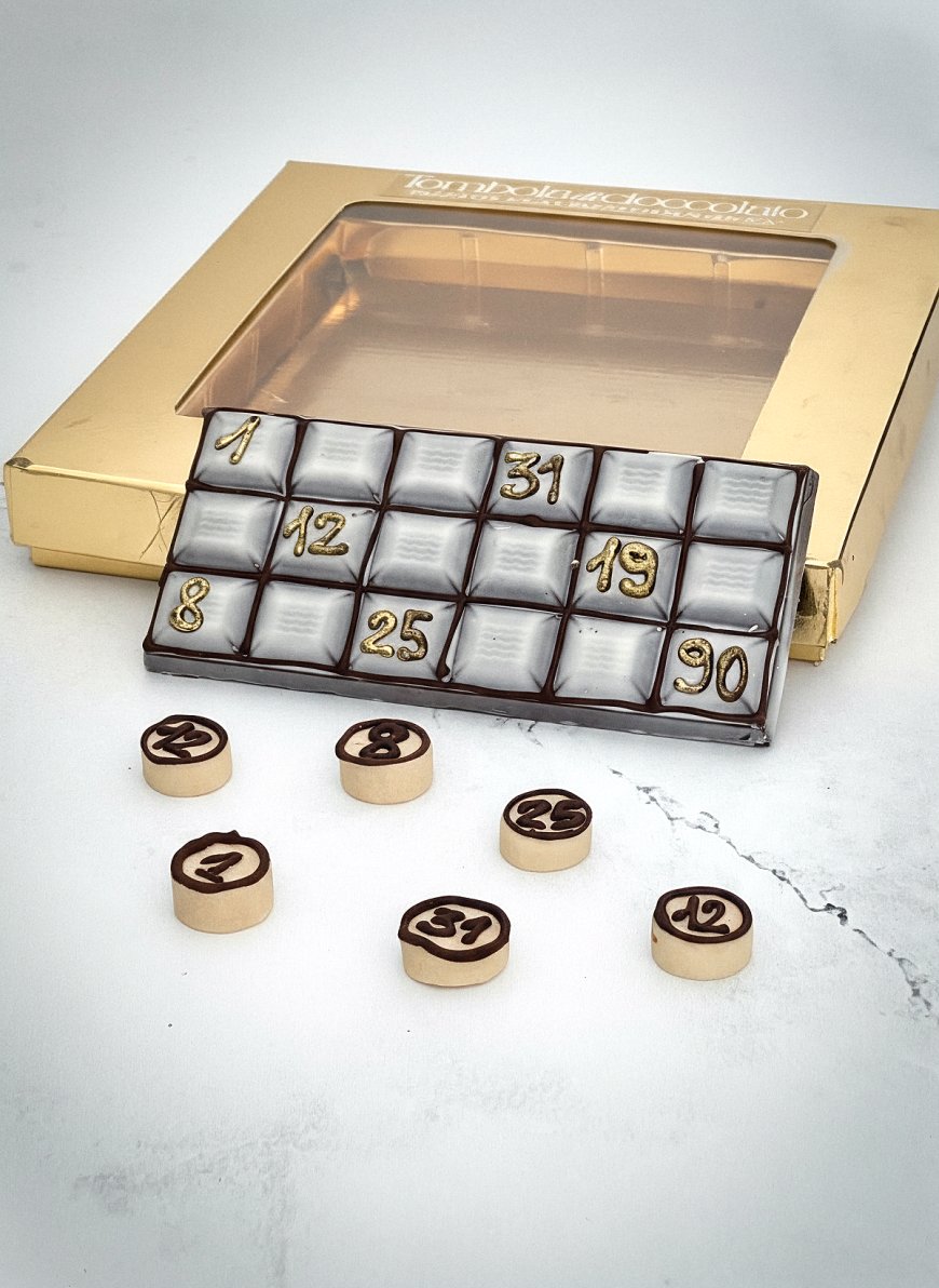 La Tombola di Cioccolato nasce dalla tradizione partenopea del gioco e unisce convivialità e alta pasticceria. Si presenta come una vera cartella del gioco, realizzata interamente in cioccolato di altissima qualità. Ogni numero iconico della tombola diventa un piccolo tassello da gustare, trasformando un rito familiare in un momento di piacere dolce e condiviso. La creazione celebra la cultura popolare e l'atmosfera del Natale in famiglia, sorprendendo per il sapore intenso e avvolgente. Con il claim "Pazzo chi gioca e pazzo chi nun ghioca", la Tombola di Cioccolato incarna lo spirito giocoso e inclusivo delle feste, reinterpretato con eleganza.