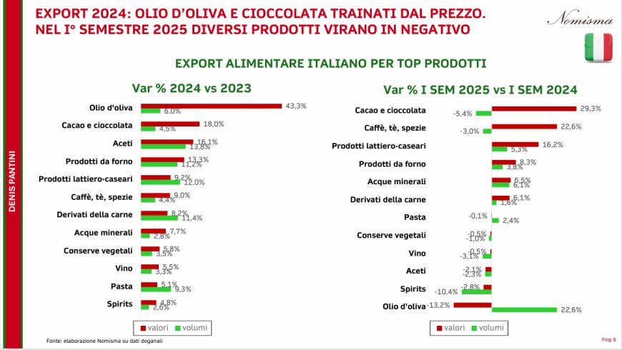Una componente significativa della crescita dei valori export è attribuibile al fattore prezzi: l'olio d'oliva ha registrato l'anno scorso un'impennata del +43% in termini di valore, a fronte di un incremento contenuto del +6% sui volumi. Questa dinamica ha caratterizzato nel primo semestre 2025 anche caffè e cioccolato, settori che hanno risentito dei forti aumenti delle rispettive commodity (+73% e +27%). Sul fronte positivo per le quantità si segnalano lattiero-caseario, bakery e acque minerali, mentre registrano contrazioni vino, aceti e spirits.