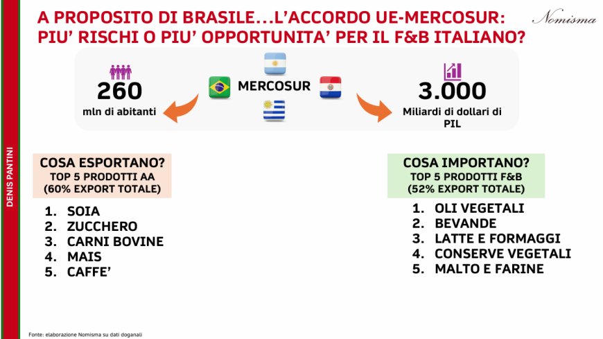 "Lo scenario di mercato a livello globale evidenzia un'alterazione negli scambi di prodotti alimentari, in larga parte determinato dagli impatti della nuova politica commerciale dell'amministrazione americana e i cui effetti per l'Italia non si circoscrivono al solo commercio diretto verso gli Stati Uniti, ma si espandono anche agli altri mercati di sbocco del nostro Food&Beverage – ha dichiarato Denis Pantini, Responsabile Agrifood Nomisma –. Lo sviluppo di nuovi mercati in una logica di maggior diversificazione diventa quindi prioritario in questo nuovo contesto geopolitico, da raggiungere sia attraverso il supporto istituzionale (ad esempio mediante nuovi accordi di libero scambio) ma anche mediante sinergie promozionali e commerciali tra imprese".