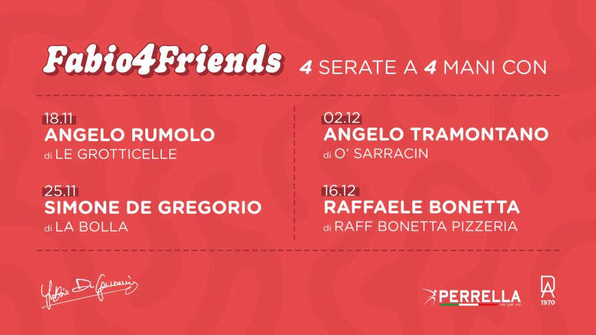 EVENTI - Fabio Di Giovanni ospita nella sua pizzeria Don Antonio 1970 di Salerno quattro maestri pizzaioli per la rassegna Fabio4Friends, dal 18 novembre al 16 dicembre. Angelo Rumolo, Simone De Gregorio, Raffaele Bonetta e Angioletto Tramontano saranno protagonisti di quattro serate a quattro mani che proporranno cene degustazione di altissimo livello, esplorando filosofie diverse legate alla pizza: dalla ruota di carro alla pizza contemporanea, dalla pizza dolce all'innovazione nelle tecniche di impasto.