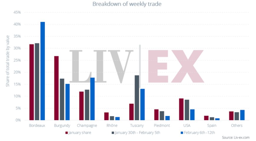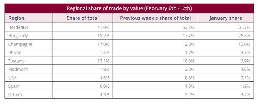 Quote regionali degli scambi (6–12 febbraio) Bordeaux sale al 41% del valore totale scambiato, Champagne cresce al 17,8% e la Toscana si attesta al 13,1%. La quota USA scende al 4,6%, in calo rispetto alle settimane precedenti, confermando una fase di maggiore cautela della domanda statunitense.