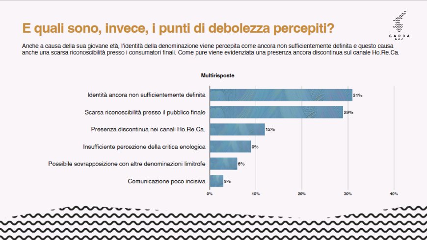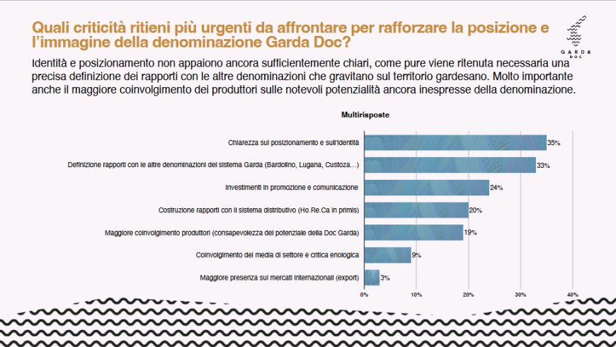 Tra le criticità più urgenti da affrontare, la "chiarezza sul posizionamento e sull'identità" è al primo posto con il 35% delle risposte. La "definizione dei rapporti con le altre denominazioni del sistema Garda (Bardolino, Lugana, Custoza...)" è stata indicata dal 33%, mentre gli "investimenti in promozione e comunicazione" sono stati menzionati dal 24%. Questi aspetti richiedono un'attenzione prioritaria per garantire una crescita sostenibile e un posizionamento distintivo nel mercato.