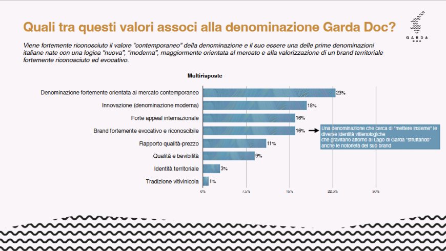 Per quanto riguarda i valori associati alla Garda Doc, spicca la percezione di una "denominazione fortemente orientata al mercato contemporaneo", indicata dal 23% delle risposte. L'"innovazione (denominazione moderna)" e il "forte appeal internazionale" sono stati citati rispettivamente dal 18% e dal 16% degli intervistati, a pari merito con un "brand fortemente evocativo e riconoscibile" (16%). Il percepito di queste caratteristiche fanno desumere che Garda Doc è in linea con i trend del mercato e vanta una forte attrazione internazionale data dalla notorietà del Lago di Garda nel mondo.