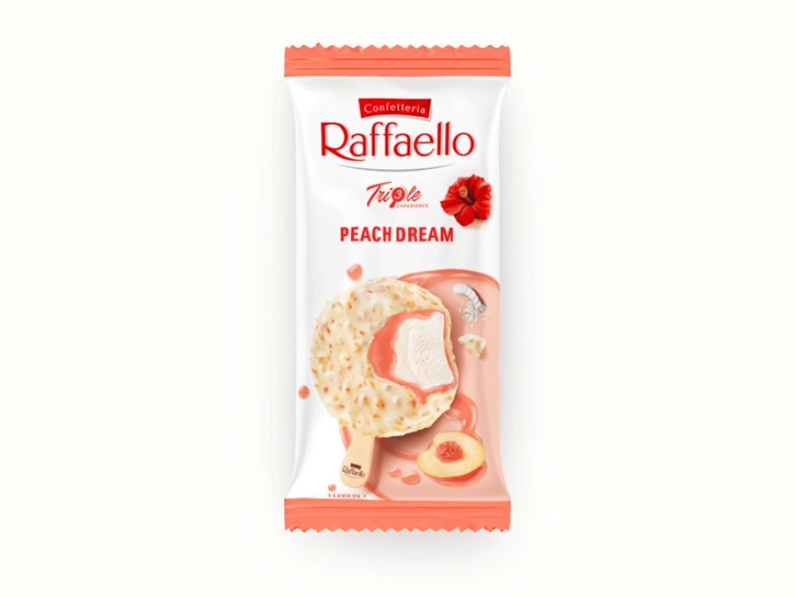 - Raffaello Triple Experience Peach Dream: gelato al cocco con note di pesca bianca e ibisco, caratterizzato da una copertura croccante che crea un'esperienza di gusto tropicale.