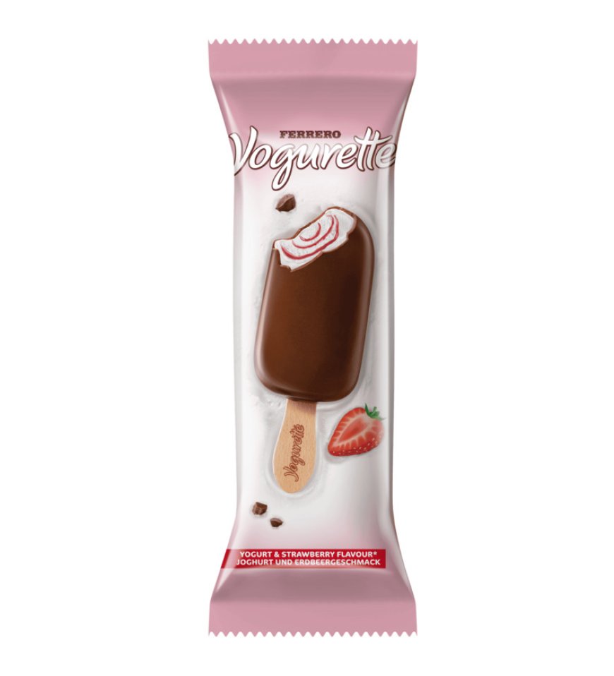 - Yogurette Ice Cream: gelato al latte con gusto yogurt e fragola, variegato alla fragola e rivestito di cioccolato al latte croccante, per un'esperienza rinfrescante e coinvolgente.