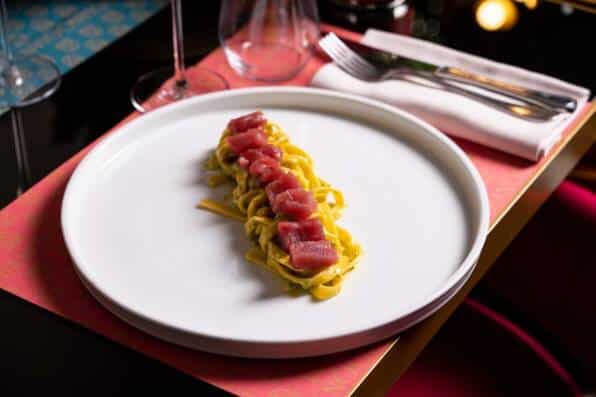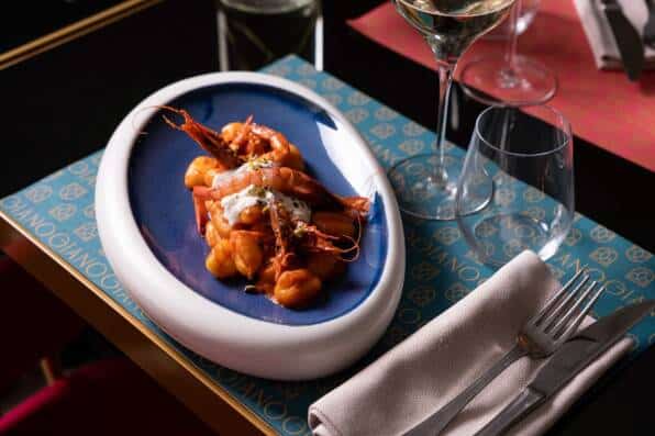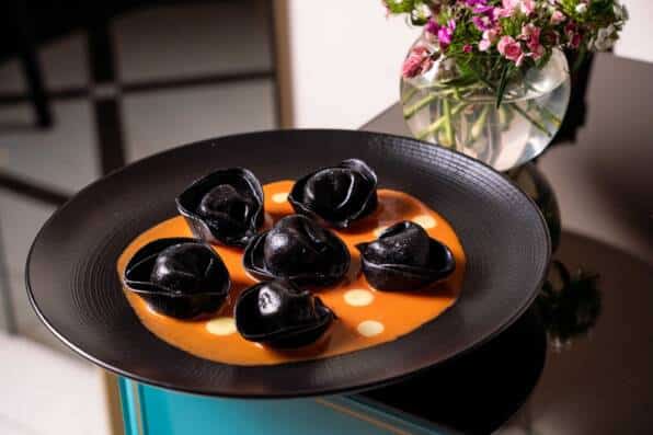 Tra i primi piatti che compongono il menu c’è una vasta scelta di pasta fatta in casa, come i Tortelloni ripieni di Cernia al nero di seppia, gli Gnocchetti con gamberi rossi cotti e crudi, accompagnati dalla burrata di Andria e pistacchi, oppure le classiche Linguine all’Astice.