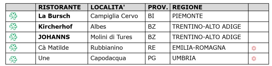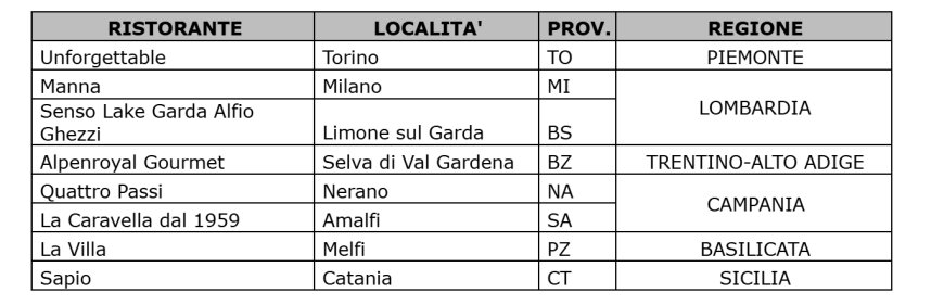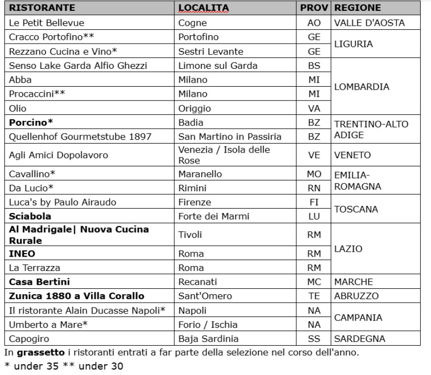 Ventidue invece le novità una Stella MICHELIN. Tra queste, 6 ristoranti sono entrati a far parte della selezione in corso d’anno e sono segnalati in grassetto.