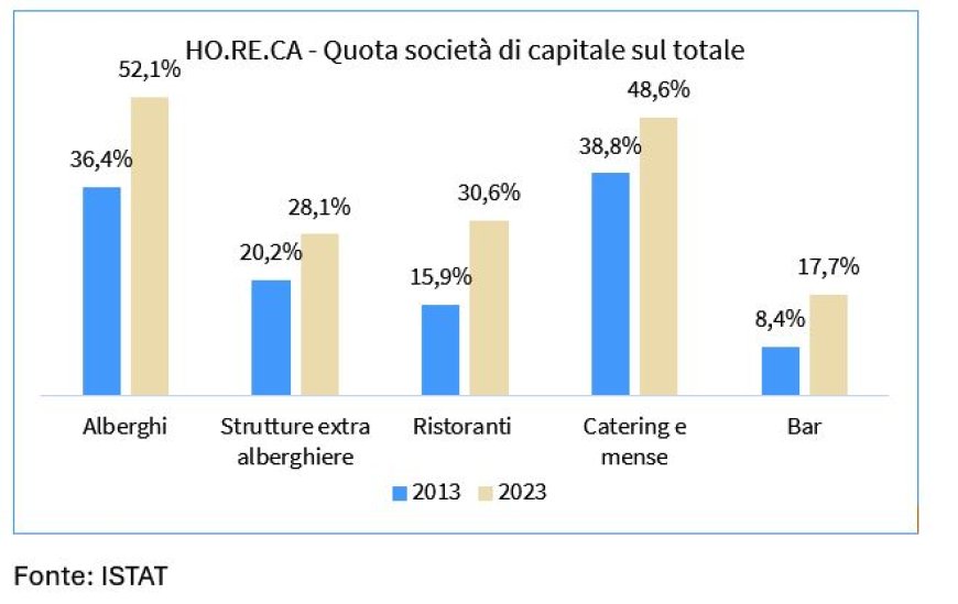 Parallelamente, cresce il numero di società di capitali, fenomeno che suggerisce una maggiore tendenza verso un sistema imprenditoriale più strutturato. L'aumento più consistente riguarda gli alberghi, dove le società di capitali hanno superato il 52%, seguiti dai ristoranti (30,6%) e dai bar, che raddoppiano la propria quota in dieci anni, passando dall'8,4% al 17,7%. Nel catering e mense la quota raggiunge il 48,6%, nelle strutture extra-alberghiere il 28,1%.