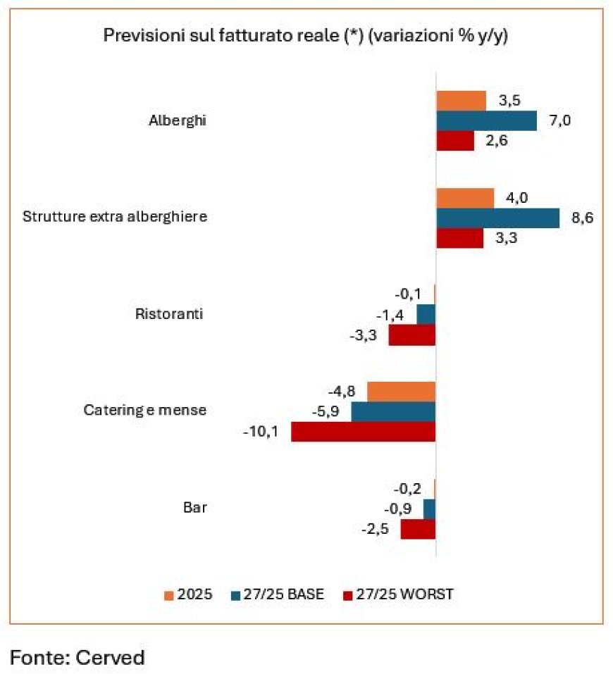 Le stime Cerved indicano una prosecuzione della tendenza positiva post-covid, ma con performance differenziate. I comparti con le migliori previsioni di fatturato reale nel biennio 2026-2027 sono le strutture extra-alberghiere (+8,6%) e il settore alberghiero (+7%). Bar (-0,9%) e ristoranti (-1,4%) sono attesi in leggera contrazione, mentre il calo più marcato riguarda catering e mense (-5,9%), con uno scenario pessimistico che potrebbe amplificare la flessione fino al -10%.
