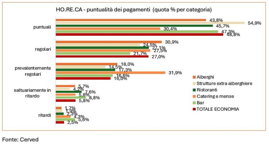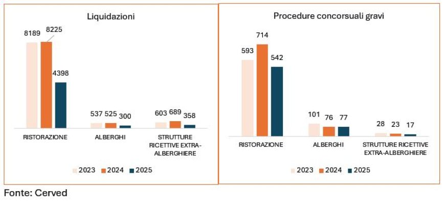 Sul fronte dei pagamenti, la maggioranza dei comparti Horeca esibisce pagamenti puntuali, con quote che variano dal 55% delle strutture extra-alberghiere al 30% di mense e catering. I bar registrano i maggiori ritardi, con oltre il 5% delle fatture pagate in ritardo, seguiti da catering e mense (4%). Alberghi e strutture extra-alberghiere mostrano invece performance migliori della media nazionale. Le procedure concorsuali e le liquidazioni appaiono in diminuzione nel 2025, in controtendenza rispetto al totale nazionale, dopo che ristorazione e strutture extra-alberghiere avevano registrato il picco nel 2024.