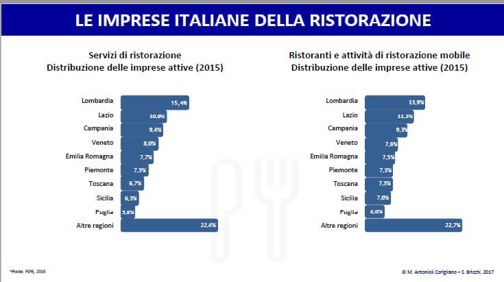 LA RISTORAZIONE IN ITALIA: PROSPETTIVE DI CRESCITA In generale – sempre secondo i dati presentati oggi - gli italiani mangiano sempre più fuori casa, oltre un terzo della spesa alimentare delle famiglie, circa il 35% pari a 75 miliardi di euro. Un dato che, a differenza dei consumi domestici, è rimasto stabile durante la crisi e ha ricominciato a crescere negli ultimi tre anni. E che si riflette nella densità unica al mondo delle imprese di ristorazione in Italia: sono oltre 325 mila, per oltre la metà (53,1%) ristoranti ma anche attività di ristorazione mobile, a conferma della crescita del fenomeno street food. A sua volta, il 64,3% di questi ultimi sono attività con somministrazione, pari a circa 111 mila imprese. La regione che concentra più ristoranti è la Lombardia (13.9%) seguita da Lazio (11.3%) e Campania (9,3%), podio che si ripete anche nello street food. Anche nel fuori casa, come nell’imprenditoria italiana in generale, dominano le PMI: il numero medio di dipendenti è 5,6 per un totale di 376 mila dipendenti (Fonte: FIPE, 2016). Nel contesto europeo l’ospitalità italiana riveste un ruolo di primo piano. Con circa 51 miliardi di euro nel 2014, di cui il 40% riconducibile ai soli ristoranti, le imprese italiane rappresentano da sole quasi un settimo di tutto il fatturato del settore nella UE-28 (375 miliardi) e più di un decimo di tutto il valore aggiunto (18 miliardi di euro su 152), il 37,4% dovuto ai ristoranti. In Italia il settore è complessivamente cresciuto nel quinquennio 2008-2014 e le stime per il 2015 sono di un ulteriore aumento del 2,8% (Fonte: elaborazioni su dati Eurostat, 2016).