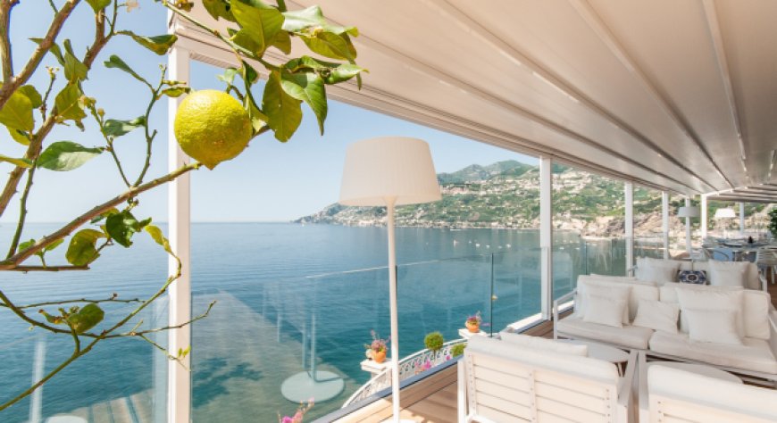 Gli arredi alternano il predominio delle tonalità chiare del bianco e del beige con accenti di colore portati dalle ceramiche di Vietri che decorano i tavoli. Il cristallo che delinea la terrazza crea un passaggio continuo tra il pavimento e il mare mentre l'ampio orizzonte trova i suoi confini nei paesi incastonati sui Monti Lattari.