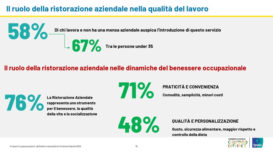 Ricerca IPSOS rivela: 76% dei lavoratori considera la mensa aziendale cruciale per benessere e socializzazione, con attenzione a salute, sostenibilità e qualità