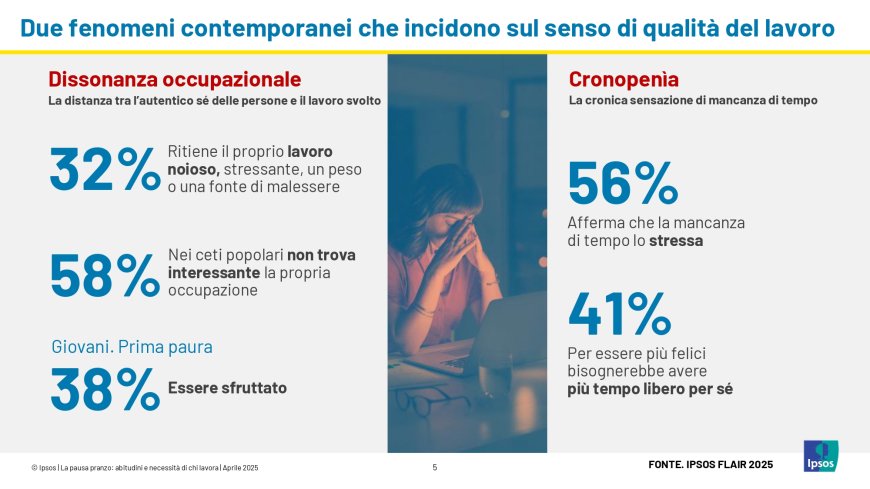 La ricerca condotta da IPSOS per l'Osservatorio CIRFOOD DISTRICT "Pausa pranzo: abitudini e necessità di chi lavora" offre dati illuminanti sul rapporto tra pausa pranzo e benessere lavorativo. In un contesto professionale caratterizzato dalla cronopenia (cronica sensazione di mancanza di tempo), il 56% dei lavoratori afferma che proprio questa carenza temporale incide sui livelli di stress, con ripercussioni sulla salute.