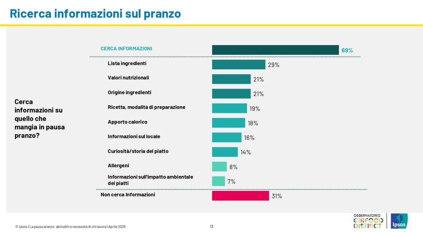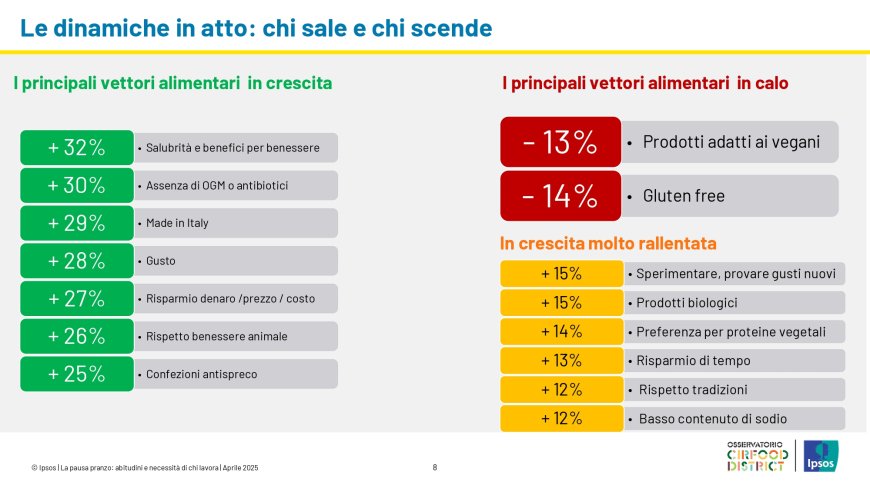 La ricerca IPSOS e l'Osservatorio CIRFOOD DISTRICT rilevano tendenze significative nelle preferenze alimentari di chi lavora: emerge una forte attenzione per salute e benessere (62%), con predilezione per pasti leggeri e salubri, insieme a un interesse marcato per sostenibilità ed etica (67%), privilegiando prodotti a km0 e rispettosi dell'ambiente.