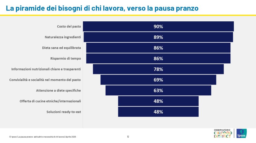 I fattori principali che guidano le scelte durante la pausa pranzo sono: costo del pasto (90%), naturalezza degli ingredienti (89%), alimentazione sana ed equilibrata (86%), risparmio di tempo (86%) e socialità nel momento del pasto (69%).
