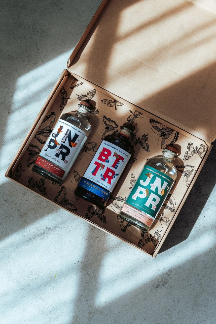 I distillati del marchio JNPR, fondato da Valerie De Sutter, contengono 0,0% di alcol, ma vengono realizzati seguendo i criteri dei distillati autentici. Botaniche, spezie e agrumi subiscono la distillazione classica in alambicco, producendo aromi decisi e una consistenza inattesa anche in assenza di alcol. Il prodotto finale è una bevanda che si integra spontaneamente nell'aperitivo, servita con tonica o acqua frizzante.