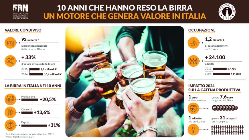 INDAGINI E RICERCHE - Novantadue miliardi di euro di ricchezza generata e oltre 24 mila nuovi posti di lavoro in dieci anni: sono i numeri che raccontano la metamorfosi della birra in Italia, passata da semplice bevanda rinfrescante a pilastro dell’economia nazionale. A certificarlo è l’ultimo studio dell’Osservatorio Birra, realizzato in collaborazione con Althesys Strategic Consultants e presentato a Roma presso il Senato della Repubblica in occasione dei dieci anni di Fondazione Birra Moretti, pioniera nella misurazione del valore economico della filiera birraria.
