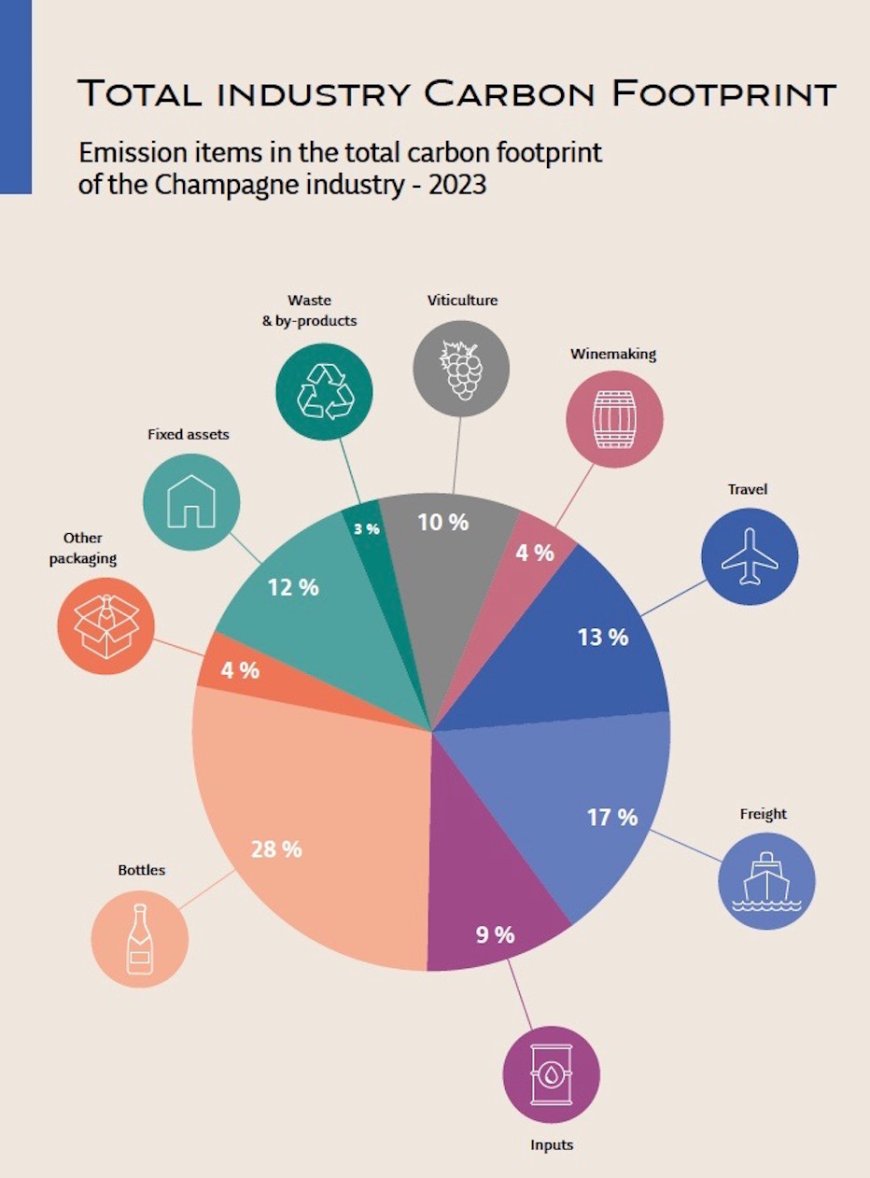 Distribuzione delle emissioni lungo la filiera Champagne (2023). La produzione delle bottiglie rappresenta la principale fonte di CO₂ (28%), seguita dal trasporto delle merci (17%) e dai viaggi legati alle attività del settore (13%).
