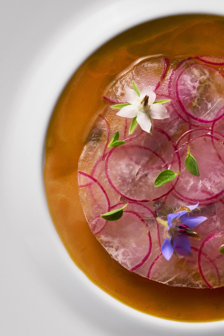 MAD100% Natura è il terzo e ultimo percorso: un'antologia in dieci passaggi a mano libera che restituisce, senza filtri né vincoli tematici, la visione di cucina di Mammoliti. Come fuori dalle grandi vetrate che affacciano sulle colline, anche nel piatto la natura è assoluta protagonista, grazie alla serra e all'orto di proprietà, da cui proviene la quasi totalità delle specie vegetali utilizzate al ristorante, in piatti come Erbaceo. Un carciofo appassito, farcito con pesto di carciofo alla brace, estratto di foglie chiarificate, olio alla menta, bande di gambo di carciofo, alga kombu e giardiniera '91, omaggio al primo assaggio di questa ricetta piemontese da parte dello chef.