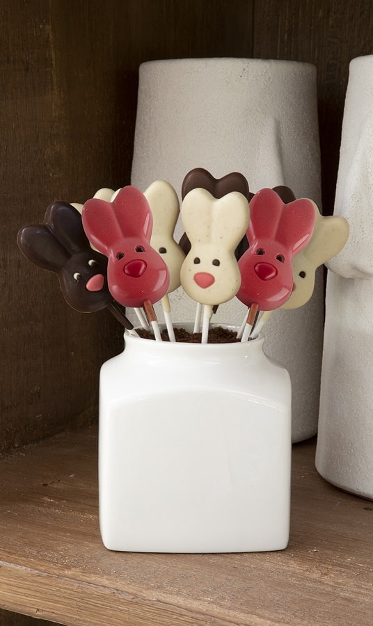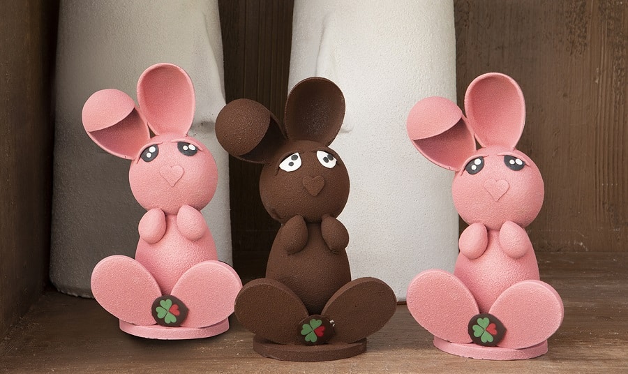 Ma il mondo Frau Knam per questa Pasqua ha in serbo altre novità, si è infatti popolato di dolcissimi personaggi che faranno la gioia di grandi e piccini. Le new entry di quest’anno sono: l’allegro Maialino Oscar realizzato interamente a mano in cioccolato fondente 58% e decorato con nuances gialle, rosa o con miscela al latte. Oscar sarà in compagnia dei simpatici Brandy e Bijou, due dolci coniglietti realizzati interamente a mano, disponibili in due versioni: cioccolato fondente 58% spruzzato con burro di cacao rosa o cioccolato al latte spruzzato con miscela al latte. E per tutti gli affezionati qualche gradito ritorno come la dolce Mamma Chioccia, apprensiva e amorevole è disponibile in due versioni: cioccolato fondente 58% o cioccolato al latte, con dettagli in cioccolato bianco e nuances colorate. Il furbo e dispettoso Coniglio Ernesto con la pancia in cioccolato bianco è disponibile in due versioni: cioccolato fondente 58% o cioccolato al latte, decorato con nuances colorate. Le deliziose Paperelle, nella doppia versione grande e piccola, dai colori vivaci, realizzate in cioccolato bianco, decorate con cioccolato fondente 58%, cioccolato bianco e burro di cacao colorato. Il tenero e paffutello Pulcino, disponibile in due versioni: cioccolato fondente 58% o cioccolato al latte, decorato con nuances colorate. Non poteva certo mancare all’appello l’amatissimo Frau Coniglio, orecchie grandi e guance da mordere, ottima alternativa al classico uovo pasquale. Disponibile in due versioni: cioccolato fondente 58% spruzzato con burro di cacao rosa o verde; cioccolato al latte spruzzato con burro di cacao rosa o verde.
