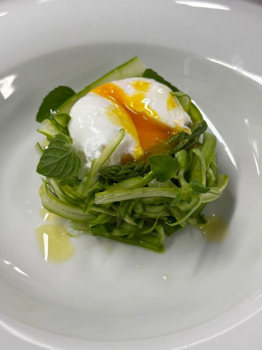 Iniziare cuocendo le uova in forno statico a 62° C per 55 minuti. Successivamente pulire gli asparagi e tagliarli a julienne, condirli con un filo di olio EVO dei Monti Lepini e un pizzico di sale. A questo punto disporre le uova in un piatto fondo agli asparagi e completate con foglioline di mentuccia romana.
