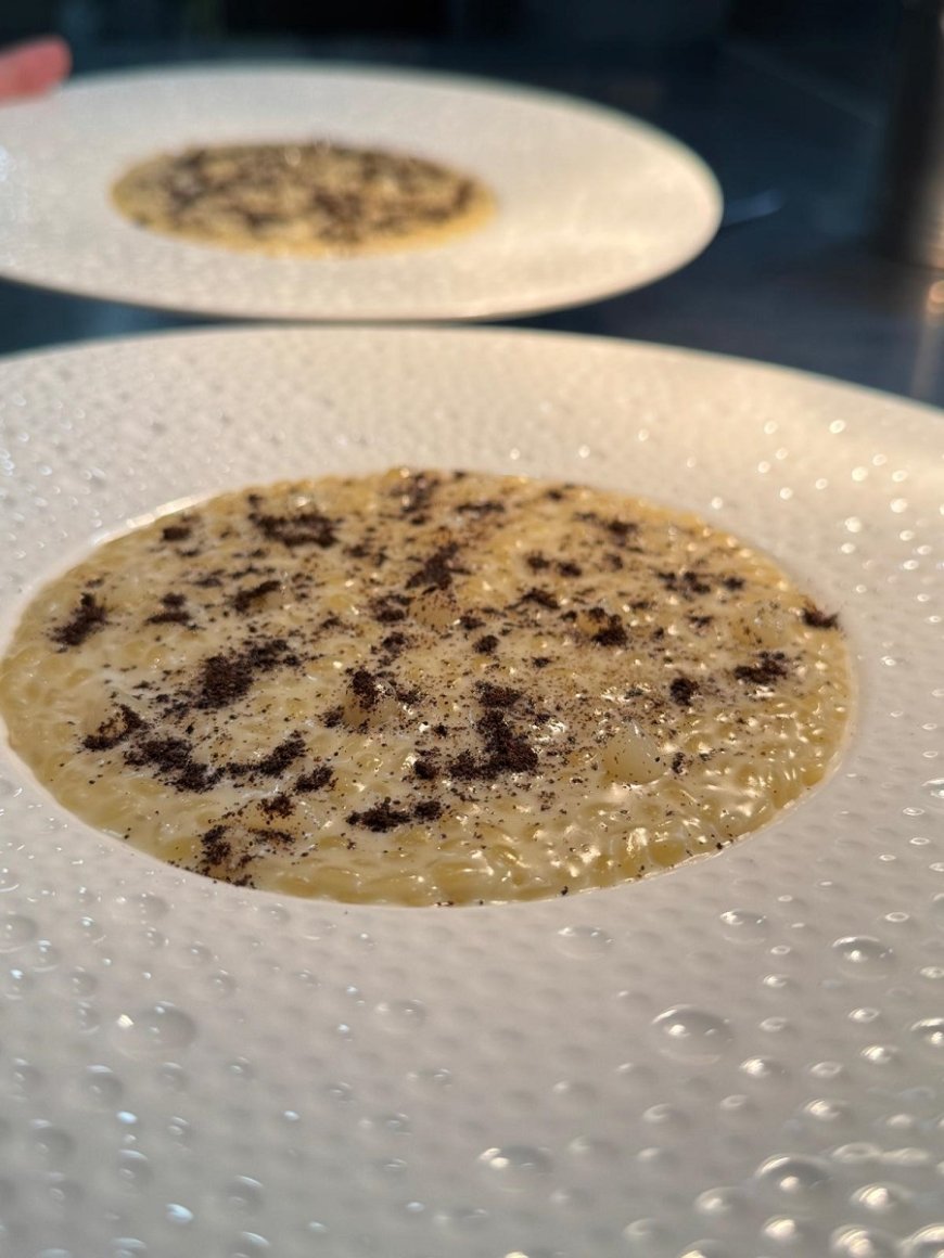 Risotto al blu di bufala con gel di bergamotto e polvere di limone nero