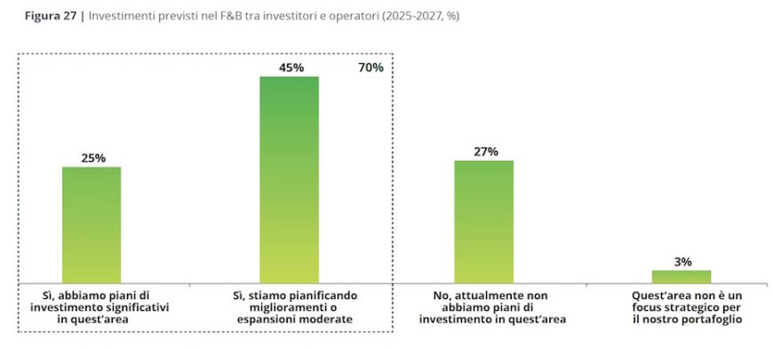 All’interno di questo processo di trasformazione, il Food & Beverage assumerebbe un ruolo sempre più strategico. Nei progetti di riposizionamento, una quota significativa degli investimenti, in media circa il 24%, verrebbe destinata agli spazi e ai concept legati alla ristorazione e al beverage. Non è assolutamente un dato marginale, segnalerebbe come il F&B sia ormai considerato un vero fattore di posizionamento, non un semplice servizio accessorio.