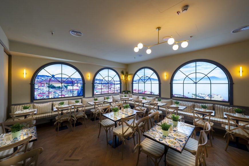 Il progetto architettonico immerge il visitatore nell'atmosfera delle strade e delle piazze di Napoli: basolato evocativo del lungomare, legno e ferro battuto delle botteghe artigiane, maioliche colorate e dettagli grafici popolari. Archi e porticati richiamano scorci urbani partenopei, mentre la palette cromatica attinge al Blu Cielo, al Rosso Pompeiano e al Giallo Napoli per costruire un'identità visiva immediatamente riconoscibile.