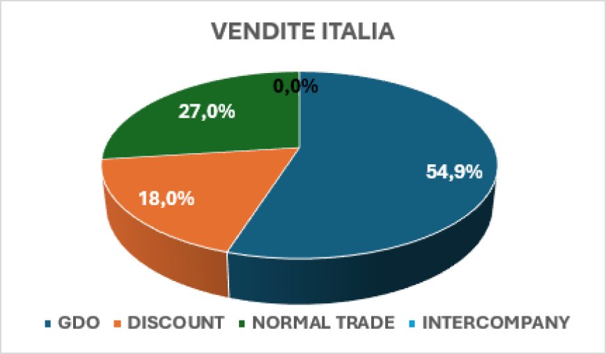Sul territorio nazionale, la Grande Distribuzione Organizzata mantiene la leadership come principale canale distributivo con una quota del 54,9%, mentre il Normal Trade raccoglie il 27% e il Discount il 18,0%.