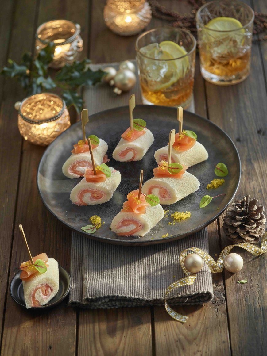Arrotolate con delicatezza le fette, ottenendo dei piccoli cilindri compatti. Sigillateli leggermente con le mani per mantenere la forma, quindi tagliateli in rollé regolari di circa 2–3 cm di spessore. Sistemate i rollé su un piatto da portata e completate ogni boccone con una piccola fettina di salmone, qualche micro-green e un tocco di caviale giallo per aggiungere colore e brillantezza. Servite subito, oppure conservate in frigorifero fino al momento del consumo. Un finger food semplice e raffinato, perfetto per accompagnare un pomeriggio di giochi natalizi o un aperitivo conviviale.