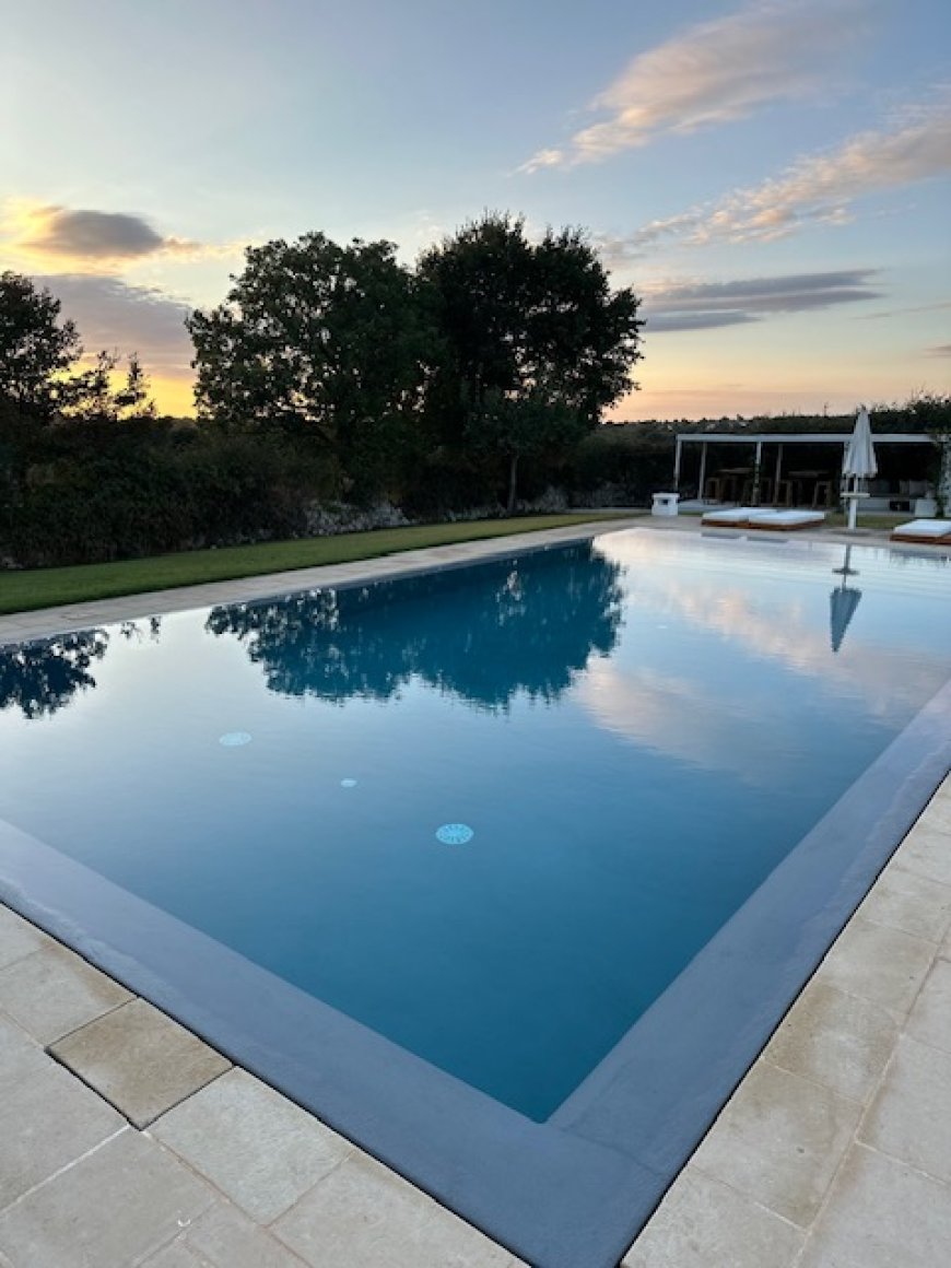 Fuori si apre la campagna, cinque ettari e mezzo di vigne, ulivi, alberi da frutto, cactus, agavi, erbe selvatiche che profumano l’aria di rosmarino e timo. In mezzo, una piscina in fibra di vetro, scelta voluta, ecologica, senza cemento, protetta dall’ombra di una grande quercia secolare.
