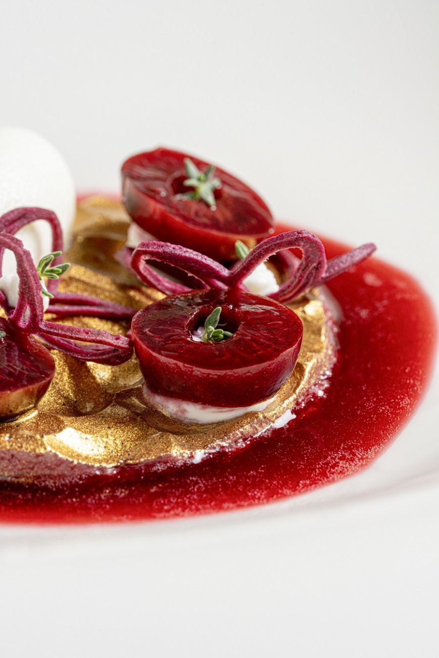 Nel menu Raccontami, il percorso senza filtri dello chef, sono tre i piatti a destare la maggior attenzione. Rapa rossa alla brace e anguria, caponata di Trètener, chipotle e crema di pinoli affumicati esalta il mondo vegetale. La caponata alla base del piatto, a base di melanzane, carote, peperoni, sedano verde, viene accompagnata dalla rapa rossa affumicata, da rose di anguria e da due creme: una ai pinoli affumicati e una crème fraîche al chipotle (un peperoncino jalapeño affumicato ed essiccato). L'antipasto gioca a 360° su note gustative e consistenze insolite. Ciliegia della Val D'Alpone, caprino, timo e yogurt è un dessert a base di una varietà di ciliegia locale, proveniente da una valle del veronese che confina con la provincia di Vicenza, qui cotta con vino rosso e succo di limone. Ad accompagnarla, pan brioche alla vaniglia, caprino al naturale, falde di ciliegie cotte con vino rosso, zucchero e succo di limone, timo, gelato allo yogurt bianco e un guazzetto di ciliegie aromatizzata al timo.
