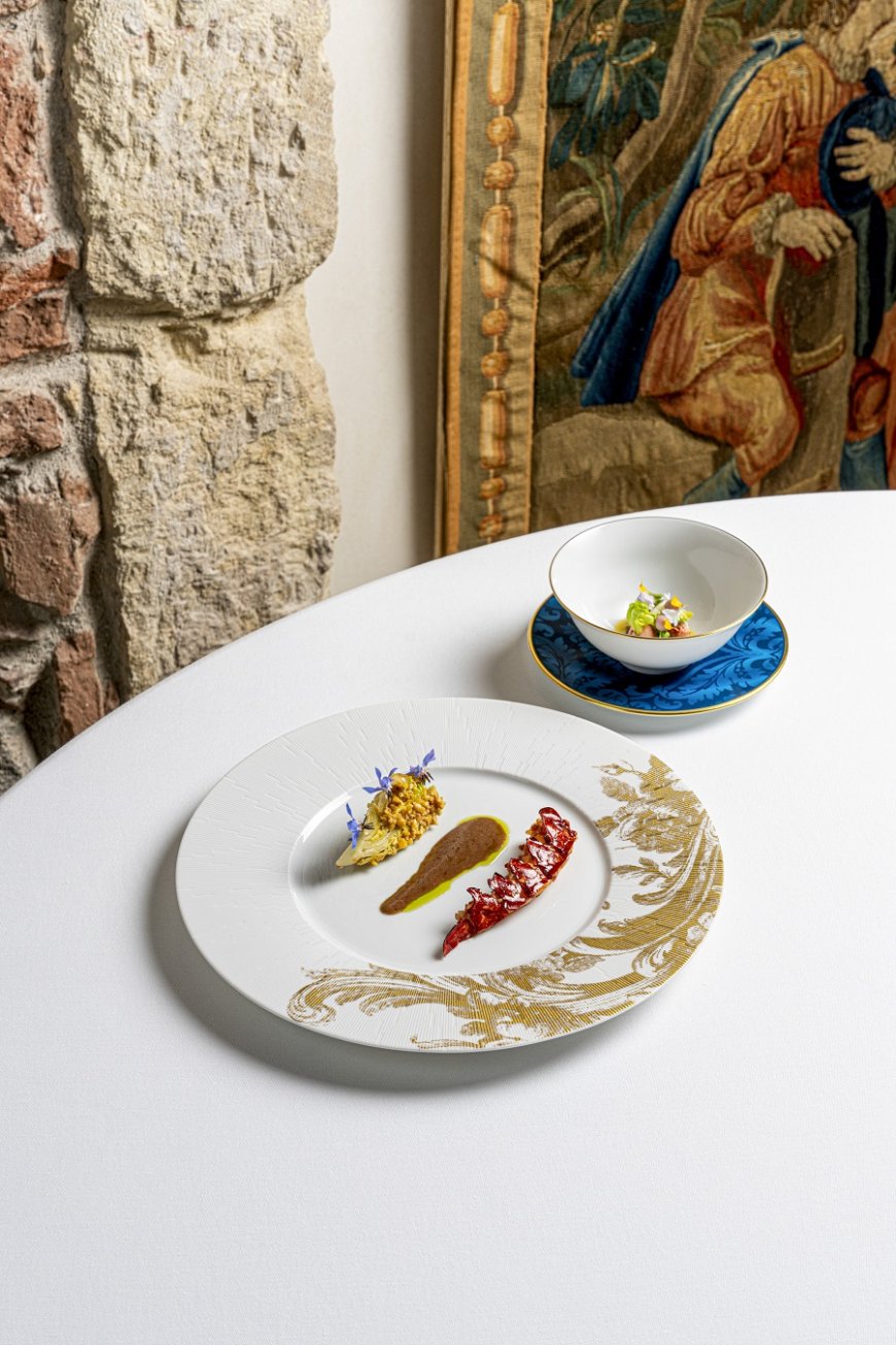 Lo Spaghetto turanico, canocchie, asparagine e liquirizia è liberamente ispirato dagli anni di esperienza fatta tra le cucine di Alfio Ghezzi e Giancarlo Perbellini. La pasta è realizzata con farina di grano Turanico dal Pastificio Mancini ed è servita su un letto di asparagine spontanee, un sugo di canocchie e polvere di liquirizia. Sogni d'oro è un dolce rimando al mondo (dorato) del miele e delle api. Gli ingredienti? Mousse alla camomilla, lastra di miele croccante, assoluto di mandorla, miele, gelato al fior di latte e mandorla, cialda croccante. Viola, cioccolato bianco, limone, rosa e more è un dessert che rimarrà in carta fino a ottobre, per via della stagionalità del fiore. Nel piatto si alternano note floreali, acide ed emotive, perché il gelato alla viola nasce da un ricordo dello chef Sacchetto, ispirato alle violette candite da lui assaggiate durante le visite alla sua famiglia in Piemonte.