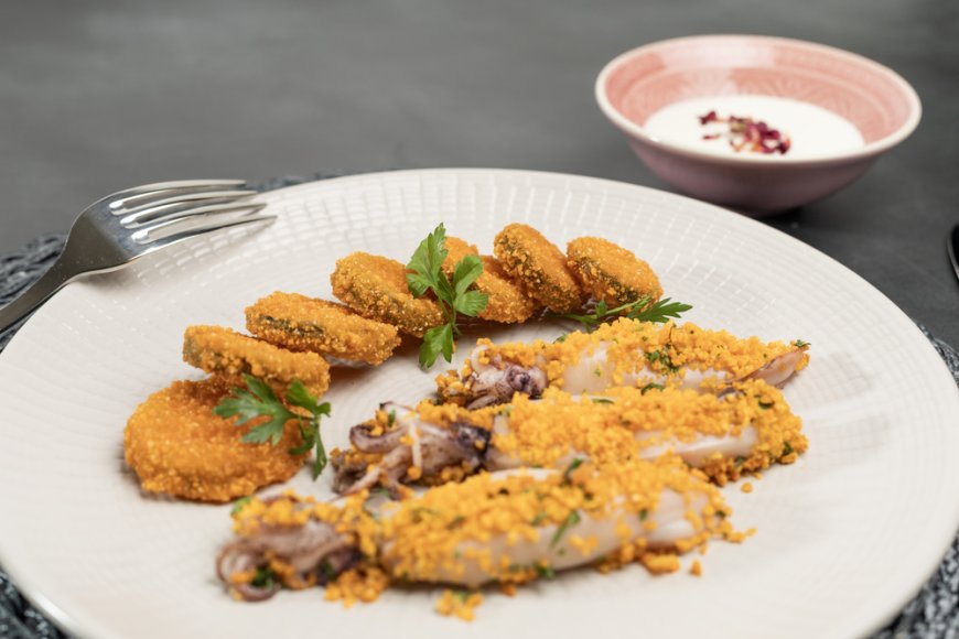 2. Passare bene i calamari interi nel pangrattato aromatizzato con curcuma e paprika e cuocerli a 200°C per 20 minuti.