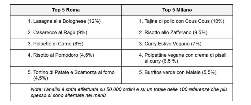 Nella Capitale le ricette tradizionali la fanno da padrone: "Lasagne alla Bolognese", "Caserecce al Ragù" e "Polpette di carne" conquistano il podio, seguite da un sorprendente "Risotto al Pomodoro" e dal "Tortino di Patate e Scamorza al forno". A Milano invece il "Risotto allo Zafferano" resta l'unico piatto a difendere la tradizione locale, classificandosi secondo subito dopo un piatto unico dal profumo internazionale - la Tajine di pollo con Cous Cous, in assoluto il più venduto nel capoluogo lombardo - e davanti a due proposte vegane come il Curry Estivo Vegan e le Polpettine vegane con crema di piselli al curry; chiudono la Top 5 milanese i Burritos verdi con maiale.