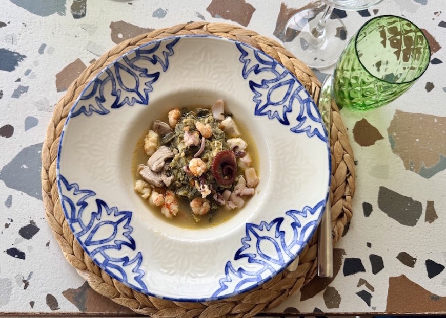 Nel piatto firmato dallo chef Francesco Fevola, la carne lascia spazio al mare: gamberi rossi, seppie, calamari, ricciola, polpo, tonno e pesce spada costruiscono una profondità diversa, mentre le verdure invernali della tradizione come bietole, cicoria, cavolo cappuccio, scarola liscia, verza, broccoli neri, tengono saldo il legame con l’origine del piatto. L’equilibrio non nasce dalla sottrazione, ma dall’ascolto, ogni elemento entra senza sovrastare, come in una minestra che chiede tempo prima ancora che tecnica.